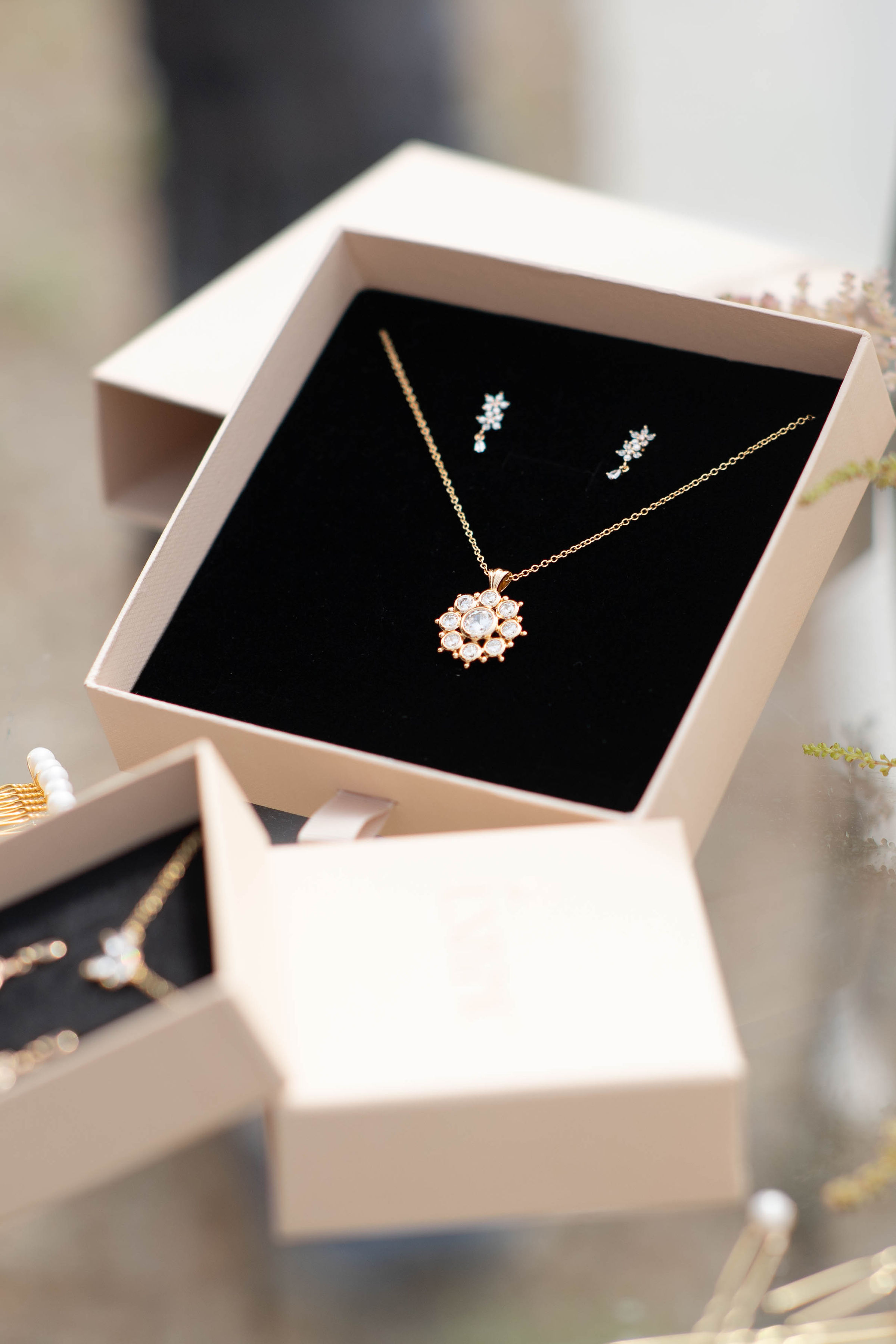 Ici, deux idées de robes possibles. La première est plus imposante, avec de la dentelle et des broderies complexes qui lui confèrent une élégance remarquable. Elle présente également une silhouette plus structurée, parfaite pour une cérémonie. La seconde robe, quant à elle, est plus délicate et fluide, parfaite pour le vin d’honneur par exemple. Elle est travaillée avec un tulle de dentelle qui ajoute une touche de romantisme et de légèreté à l’ensemble. Les bijoux disponibles ici se distinguent par leur simplicité et leur délicatesse, mettant en valeur l’élégance subtile et intemporelle. Chaque pièce est raffinée et gracieuse, ajoutant une touche de glamour discret à toutes les tenues.