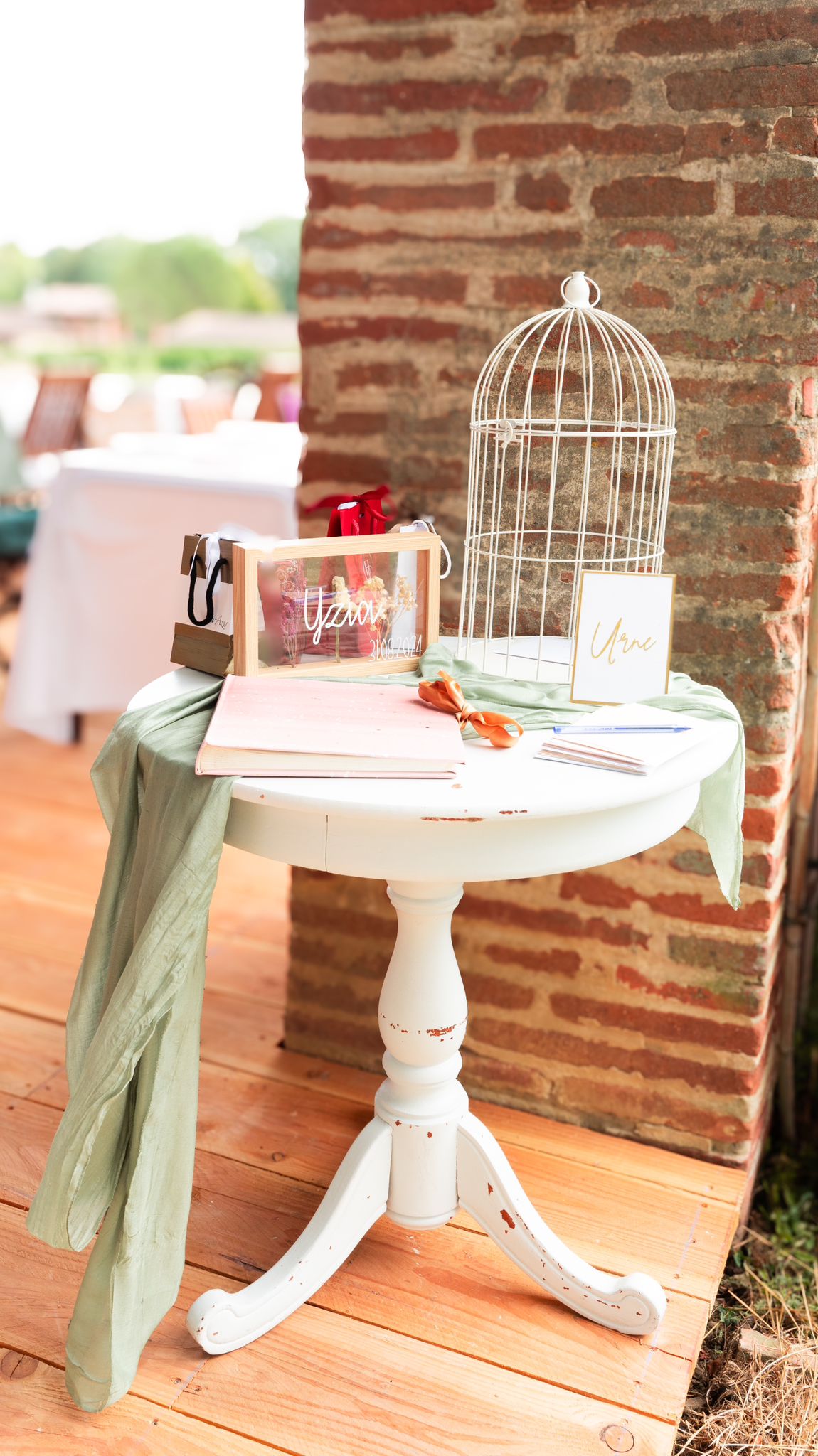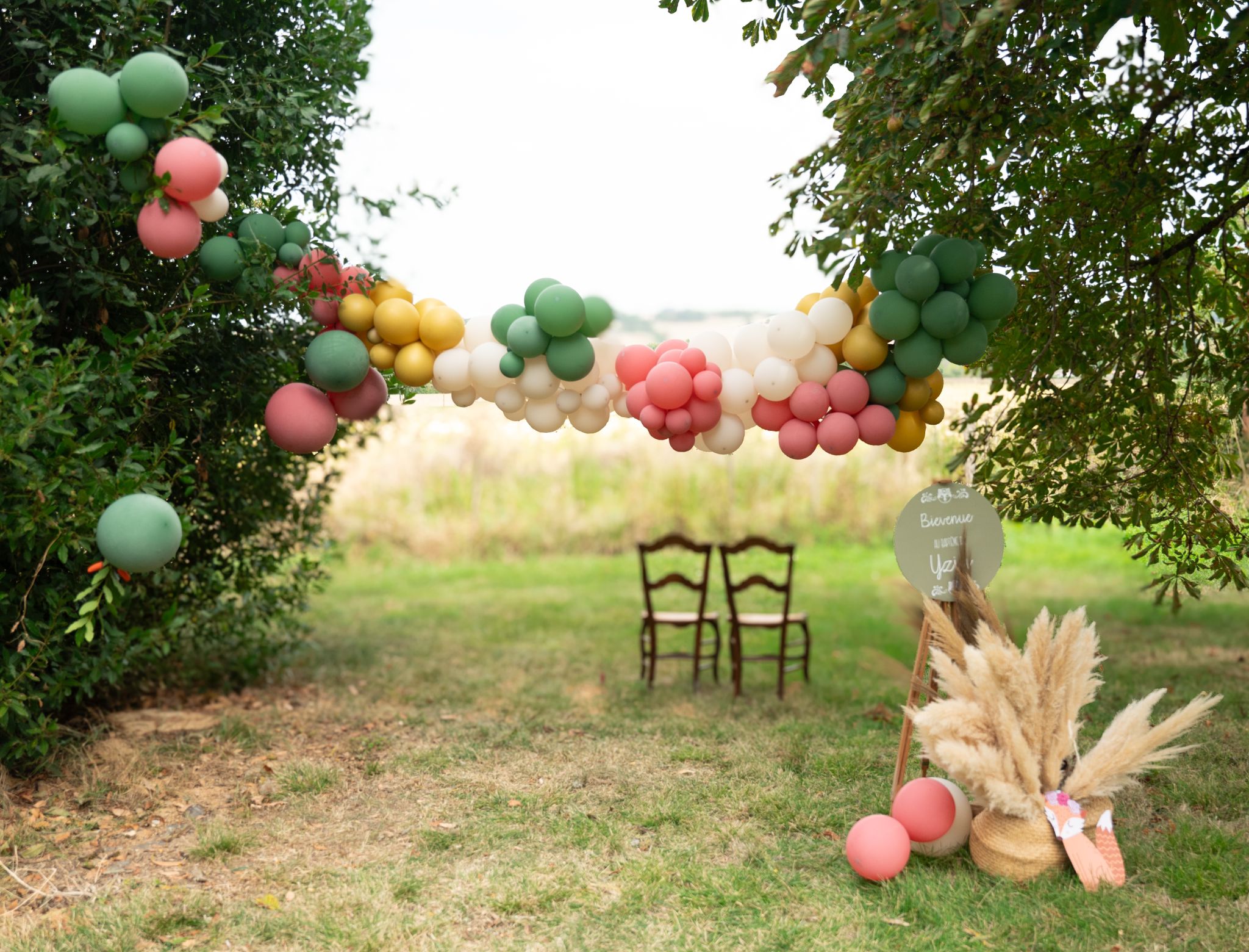 Nous avons pris en charge la décoration, conformément aux souhaits des parents, qui désiraient une scénographie à la fois élégante et sobre. Malgré un petit imprévu lors de l’installation du panneau d’accueil (qui, heureusement, n’a rien gâché à l’esthétique globale), nous avons aussi aménagé deux espaces dédiés aux photos. Bien que la météo ait été capricieuse, nous avons su trouver des solutions. Le buffet et les tables ont été ornés de fleurs, avec une décoration simple et conviviale, privilégiant des éléments tels que des roses, du bois, et des serviettes en tissu pour un rendu familial et authentique.