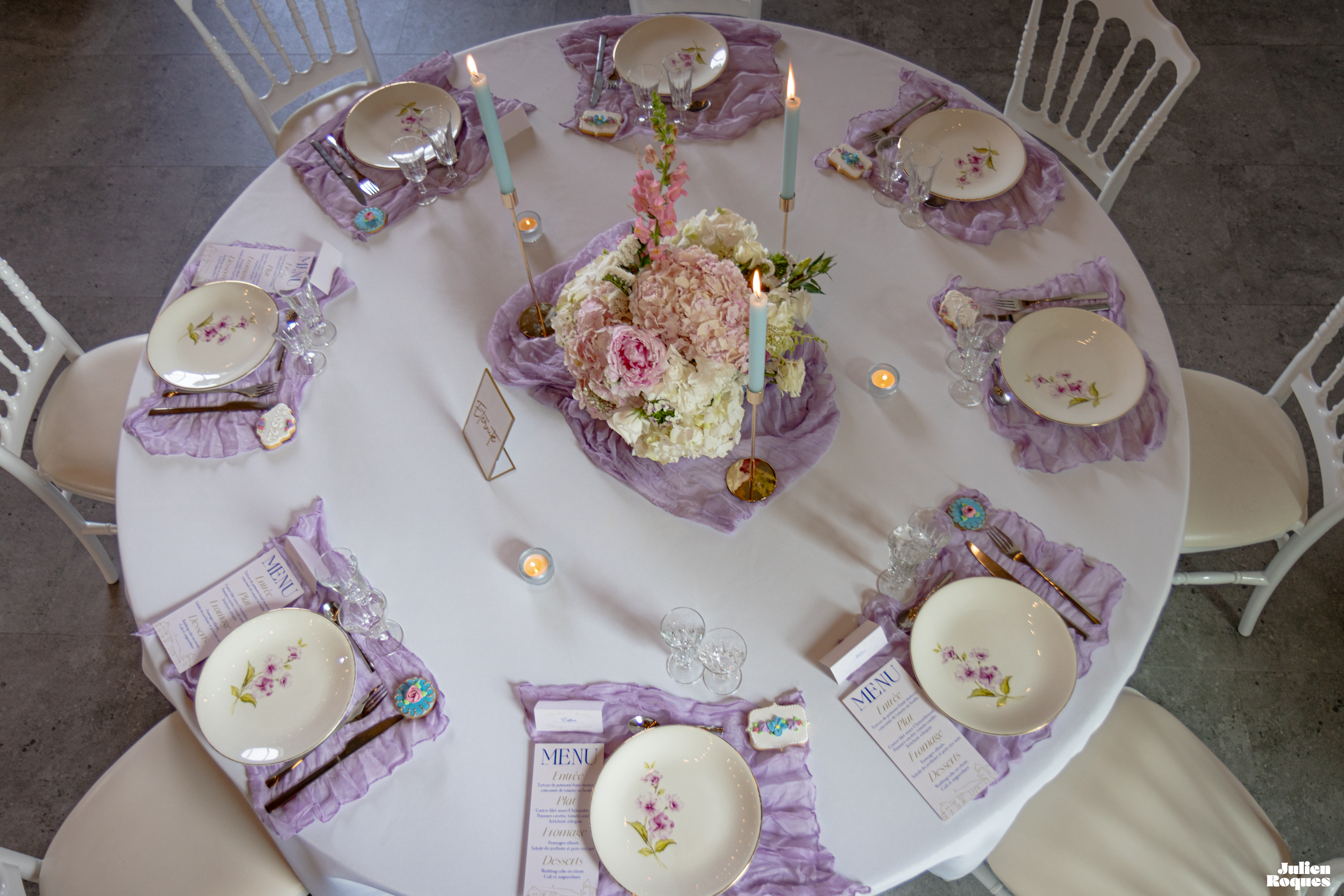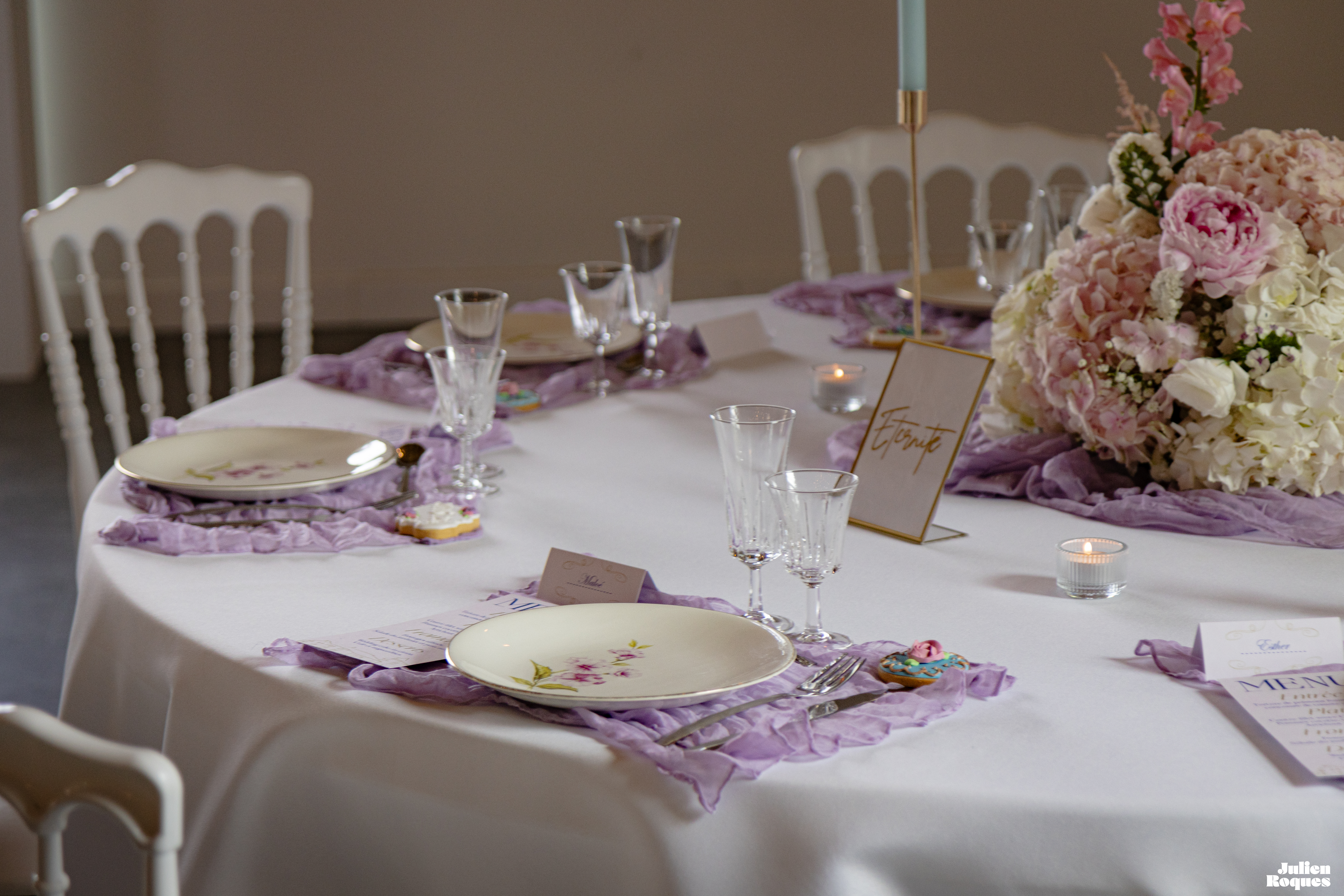 Au domaine d’En Naudet, situé entre Toulouse et Albi, nous avons eu le plaisir de décorer une table dans des nuances délicates de rose et de mauve. La vaisselle fleurie a apporté une touche vintage à l’ensemble, tandis que les chandeliers scintillants créaient une ambiance des plus chaleureuses. Au centre de la table, un bouquet de fleurs ajoutait fraîcheur et charme, sublimant l’atmosphère avec élégance.