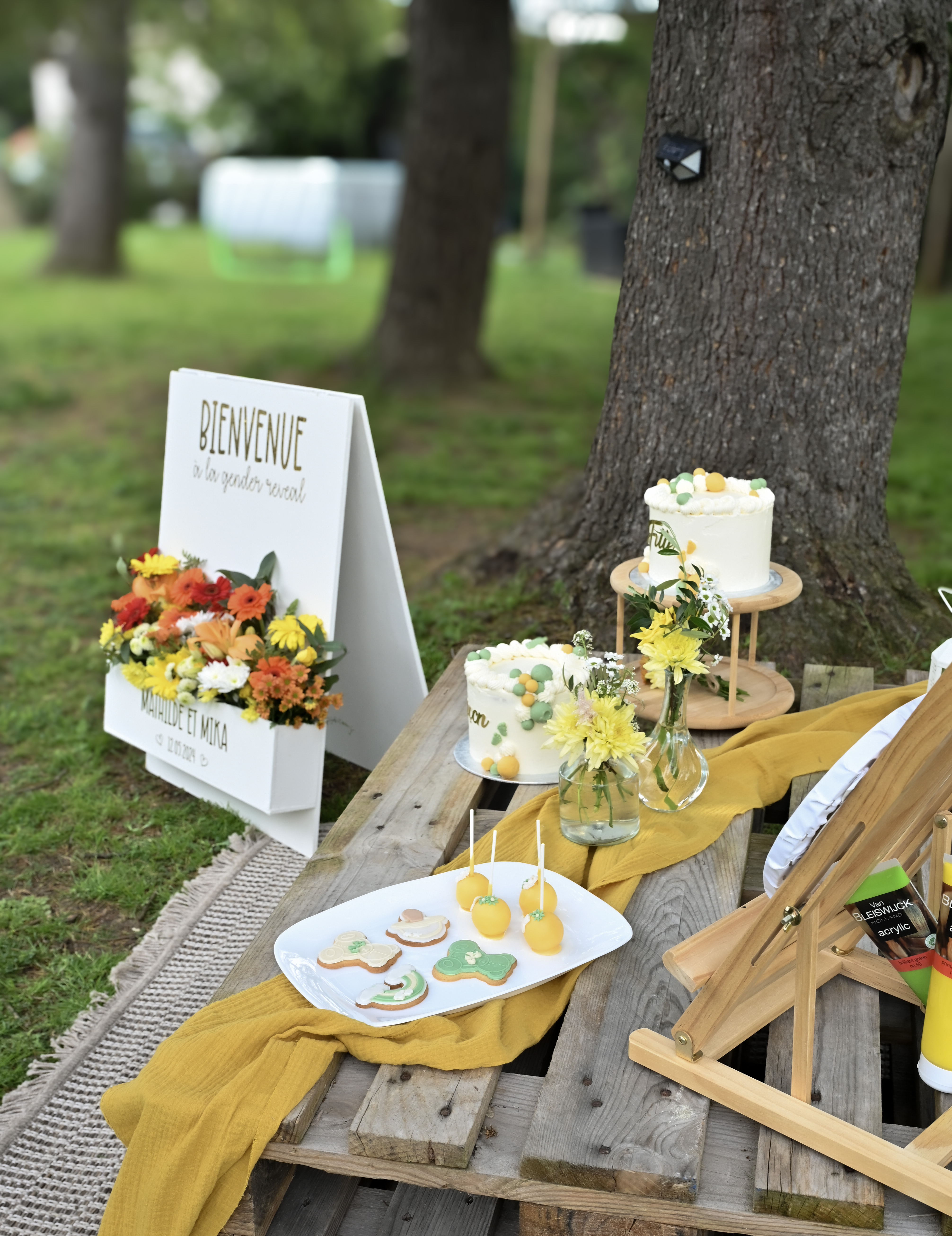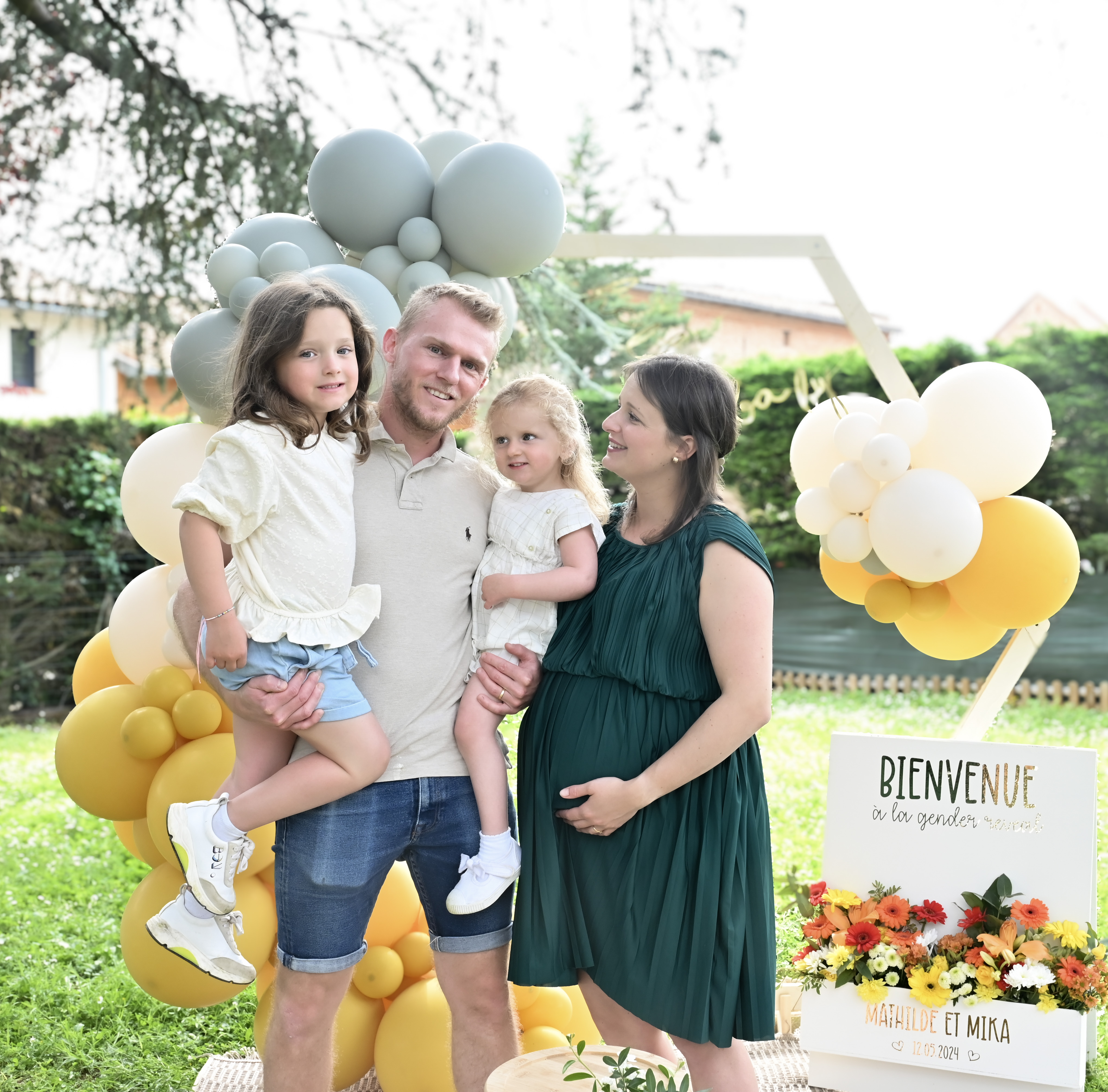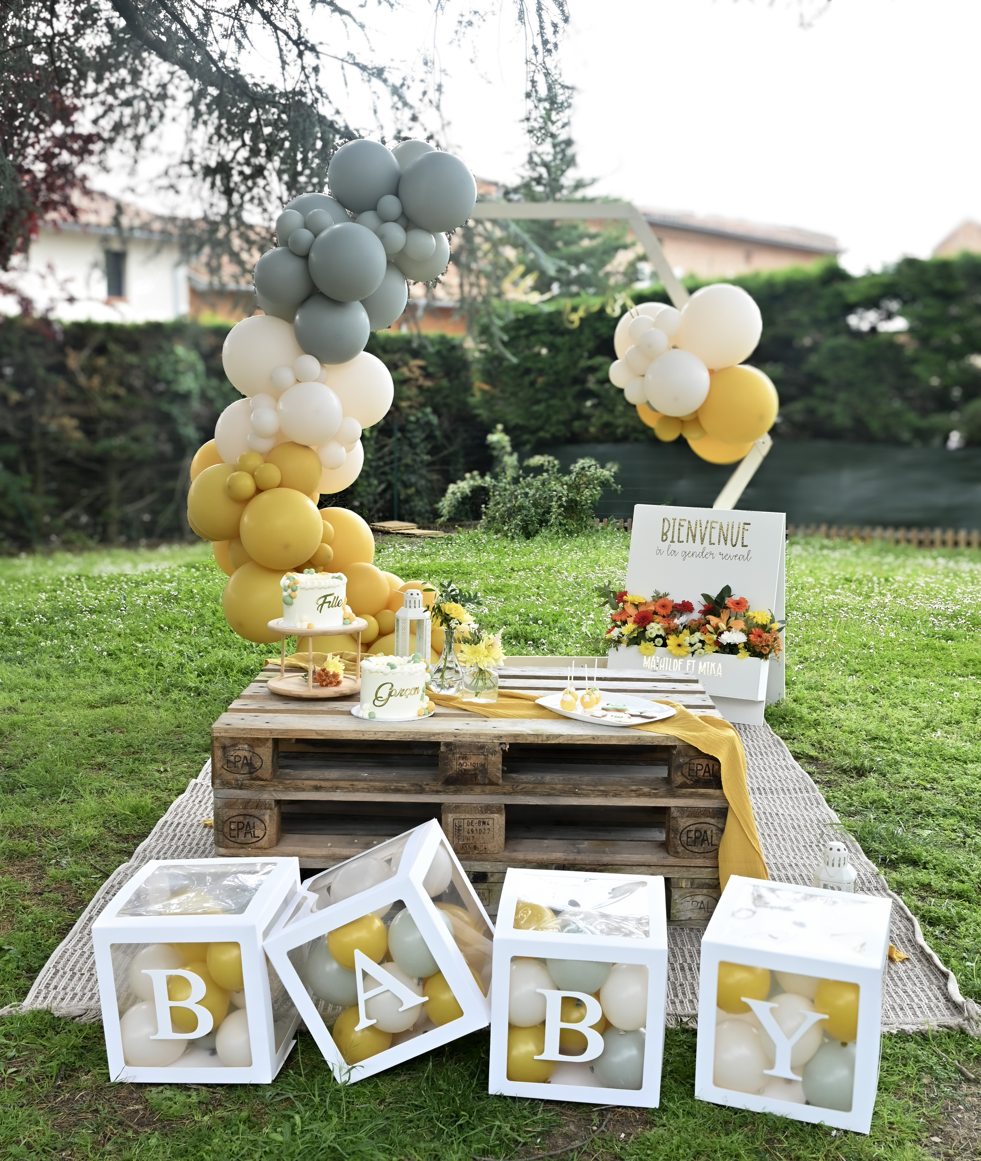 A Montlaur, proche de Toulouse, nous avons eu la joie de décorer la gender reveal de Mathilde et Mika avec des couleurs non genrées, comme le jaune moutarde et vert sauge. C’est un petit mec qui va agrandir cette belle famille!