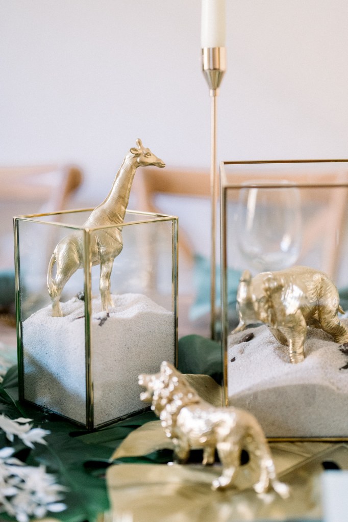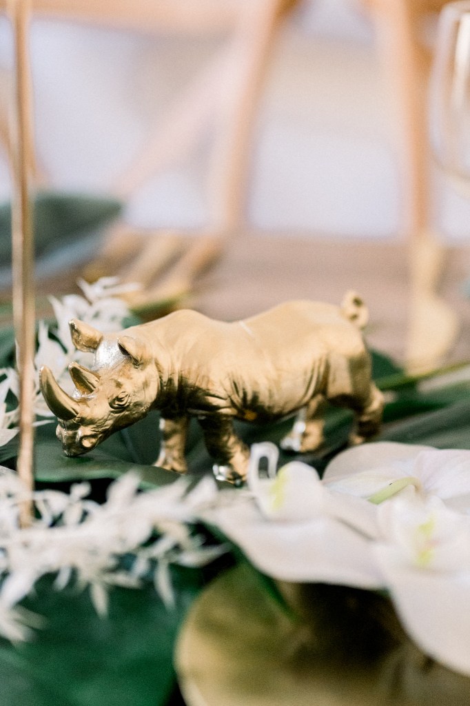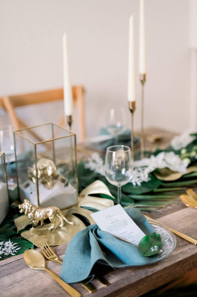 Nous avons eu le plaisir de décorer une table pour un mariage sur le thème de la jungle. L’ambiance tropicale et les éléments de la nature ont été mis en avant pour créer une atmosphère exotique et captivante. Les décors luxuriants, les motifs animaliers et les détails floraux ont contribué à donner vie à cette célébration unique.